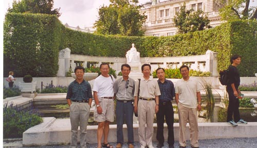 2002年8月21日倪铁平先生陪同黑龙江省委副书记周同战先生,组织部副部长杨东奇先生,省外办副主任李清贵先生,组织部培训处处长刑绪斌先生,奥中友协副秘书长苏并列先生维也纳西西公主塑像前合影。
