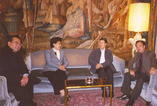 2004年10月22日,在维也纳国际机场贵宾厅中国驻奥大使卢永华先生、统战部部长刘延东女士和山东省省委书记张高丽先生,奥中经贸会会长倪铁平先生亲切交谈。