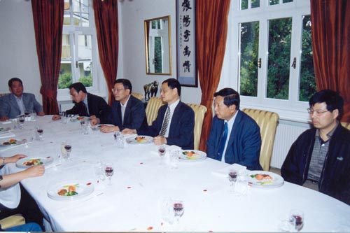2004年5月12日,中国驻维也纳联合国多边使团张炎大使在官邸宴请浙江省副省长陈加元先生一行,旅奥华人鲁家贤教授、倪铁平先生参加作陪。