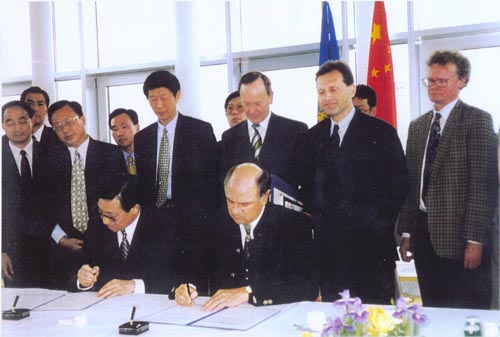 1998年6月18日倪铁平先生出席奥地利下奥州政府与浙江省政府签订友好省州仪式。浙江省省长柴松岳和下奥州州长普勒尔先生在友好省份文件上签字。