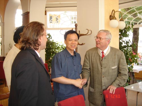 2005年7月4日中共浙江省委常委、省宣传部长陈敏尔先生与奥地利皇帝弗兰茨`约瑟夫一世的曾孙马库斯`哈斯布格先生(右1),巴登`伊舍主管文化副市长海德先生(左1)合影留念。