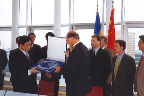 1998年6月18日倪铁平先生出席奥地利下奥州政府与浙江省政府签订友好省州仪式。浙江省省长柴松岳向下奥州州长普勒尔先生赠送纪念品。