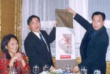 浙江省侨办副主任方士荣先生在林茨北京饭店向倪铁平先生赠送纪念品,左1为副会长柏雅莉女士。