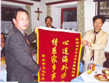 浙江省丽水市市委副书记焦光华女士向倪铁平先生赠送“心连海外侨务,情系家乡事业”锦旗。
