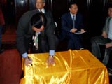 倪铁平先生在温州市纪念郑和下西洋六百周年“绿眉毛”号签名。