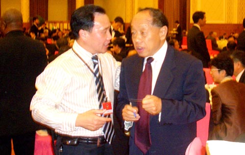 2005年9月30日在国庆56周年国宴上,奥中经贸会会长倪铁平和中国外交部长李肇星亲切交谈。