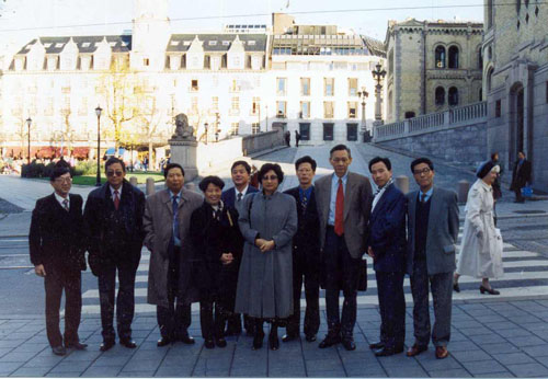 1994年10月在挪威首都奥斯陆,第四届欧华联会上倪铁平先生和国务院侨办副主任李海峰女士、国外司司长郭尚强先生等合影留念。